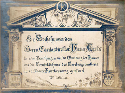 1924 Kaplan Carls übernimmt das Caritas-Büro. Als Leiter der örtlichen Caritas gründet er zahlreiche Hilfseinrichtungen, u.a. einen katholischen Männerfürsorgeverein, ein Lehrlingsheim, Arbeitsvermittlung, ein Heim für Obdachlose, Trinker-, Gefangenen-, Auswanderfürsorge, Gerichtshilfe, Eheberatung. Er führt Lebensmittelgutscheine ein, so genannte Caritas-Gutscheine. Sein Engagement ist konfessionsübergreifend. Bald gilt sein Name über Wuppertal hinaus als Inbegriff vorbildlicher und moderner Caritas-Arbeit.